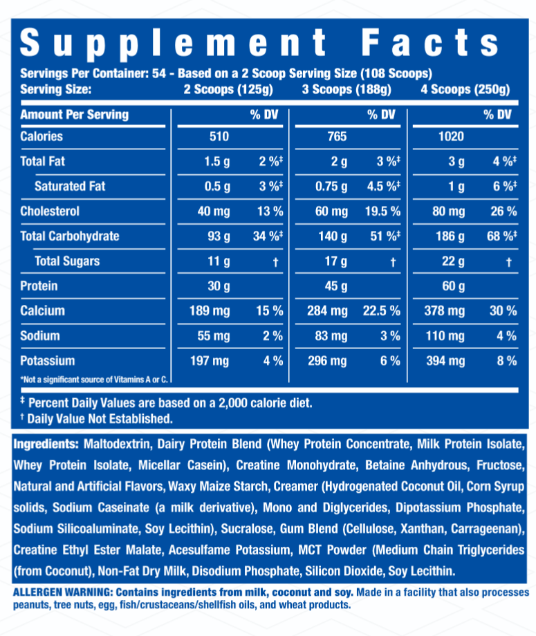King Mass 15lb XL cuenta con 60 gramos de proteína por porción para ayudar a mantener los músculos alimentados y en un optimo estado anabólico.